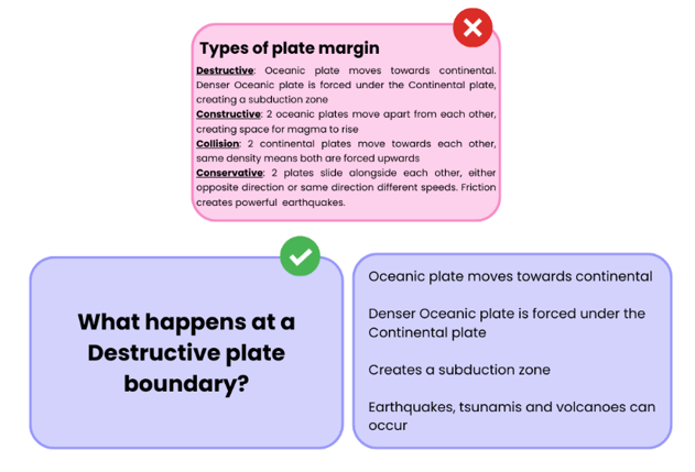 Avoid copying out large chunks of the textbook or excessive detail, as this makes cards overwhelming and less effective. Again, they shouldn’t look like a prompt or cue card!